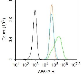 Blank control: SH-SY5Y. Primary Antibody (green line): SMAD7 Antibody  Dilution: 1ug /10^6 cells; Isotype Control Antibody (orange line): Rabbit IgG . Secondary Antibody : Goat anti-rabbit IgG-AF647 Dilution: 1ug /test.