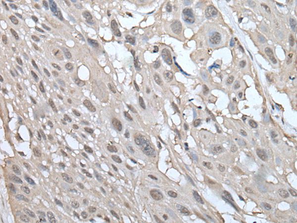 The image on the left is immunohistochemistry of paraffin-embedded Human esophagus cancer tissue using UBE2W Antibody at dilution 1/100, on the right is treated with fusion protein. (Original magnification: x200)