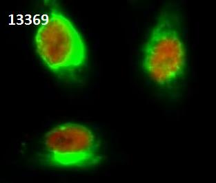 Samples were incubated with 13369(red) at a working dilution of 1/100.HSP70 Monoclonal antibody (green) was diluted at 1:200.